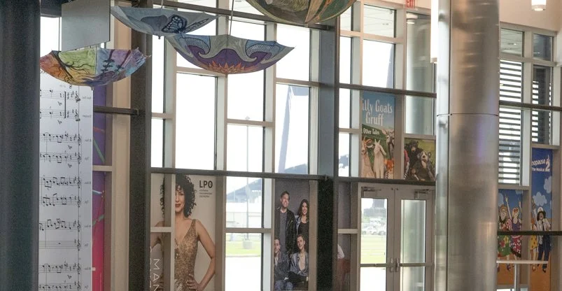 The abundance of windows at the Lafon Arts Center provided a great palette for window perfs to add color, excitement and call attention to upcoming shows. The window perfs are updated each season.