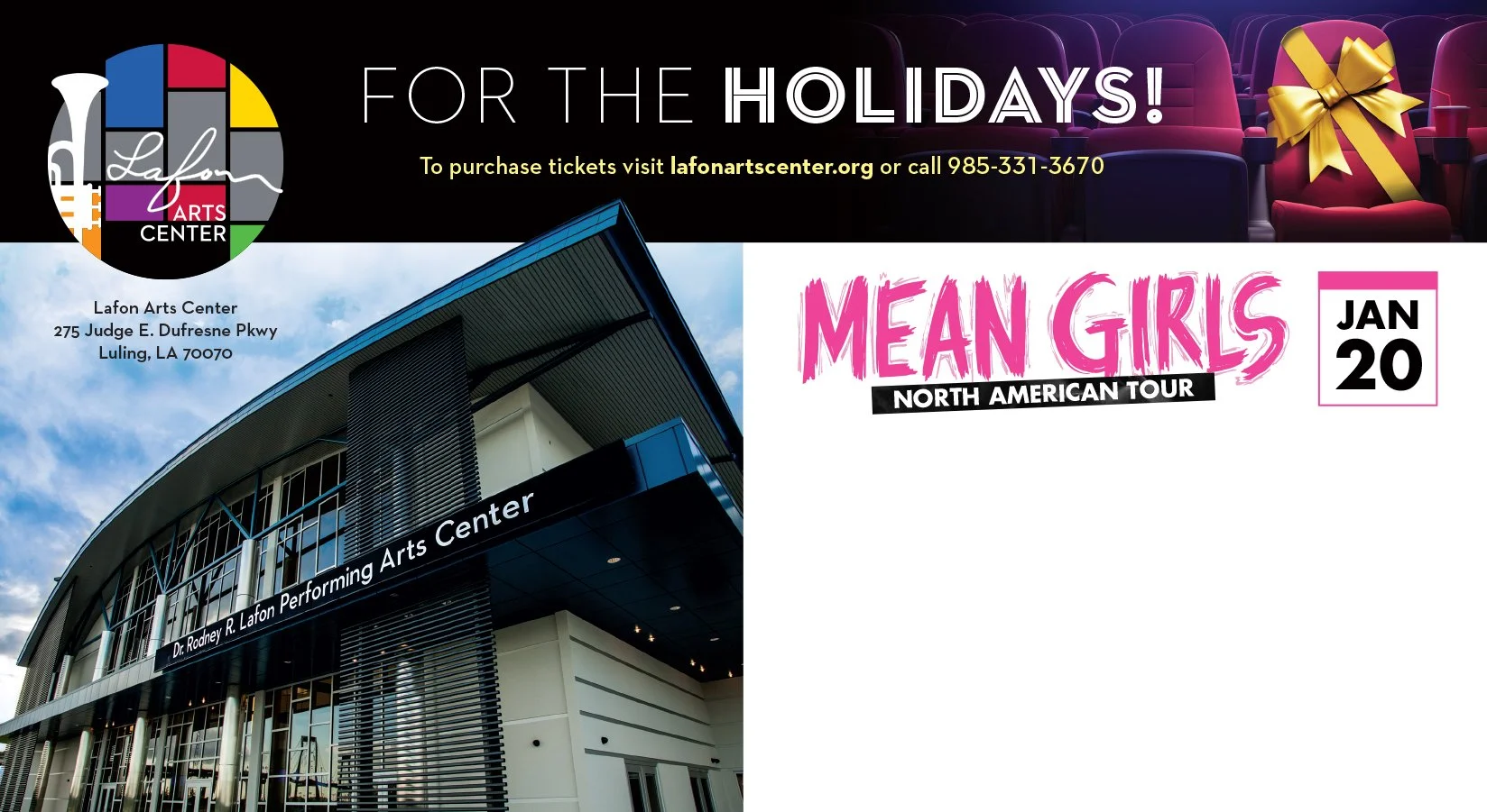 The Lafon Arts Center is located in Luling, Louisiana It’s a state of the art facility and an extension of St. Charles Parish Public Schools. The Lafon Arts Center is named after a former school superintendent in honor of his advocacy of the arts. The Center hosts popular off-Broadway productions, musical acts and school theatrical shows. Located inside the Lafon Arts Center, The Shell Theatre holds 1,300 people and the stage is larger than most Broadway spaces. The Lafon Arts Center is also the hub for arts education in the St. Charles Parish Public School System. Visually Speaking supports the Lafon Arts Center in print, environmental graphics, social media, OOH, and many other creative projects.